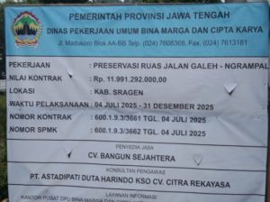 Sragen – Proyek preservasi ruas Jalan Galeh–Ngrampal, Kabupaten Sragen, Jawa Tengah, yang menelan anggaran hingga Rp 11.991.292.000,00 mendapat sorotan tajam dari masyarakat. Pekerjaan yang dikerjakan oleh CV. Bangun Sejahtera ini dinilai tidak sesuai dengan spesifikasi teknis.